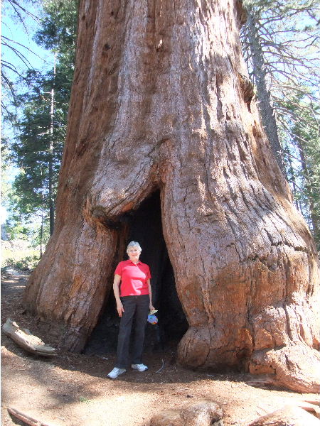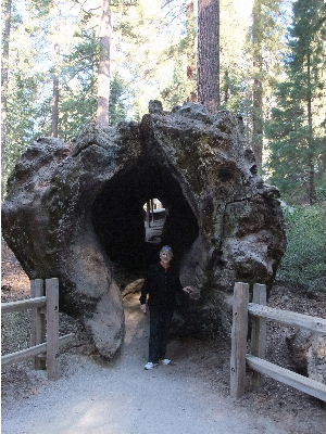 We learned that the most common cause of death of these trees is by toppling, by wind directly or by the weight of another toppling tree. They have a rather shallow root system. It couldn't very well be otherwise since there is only a little soil on top of the solid granite mountains. I don't remember how this one got hollowed out from tip to tip.